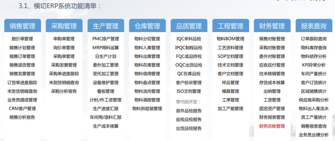 点晴模切ERP从销售、采购、生产、仓库、工程、品质、财务这七大方面为模切企业提供一整套智能信息化解决方案,通过智能分切、智能算料备料、智能防呆、二维码标签应用、移动解决方案,提升生产现场效率,订单交付能力以及降低库存堆积三大智能提升核心竞争力,为企业实现智能、高效、便捷以及低成本的管理目标。