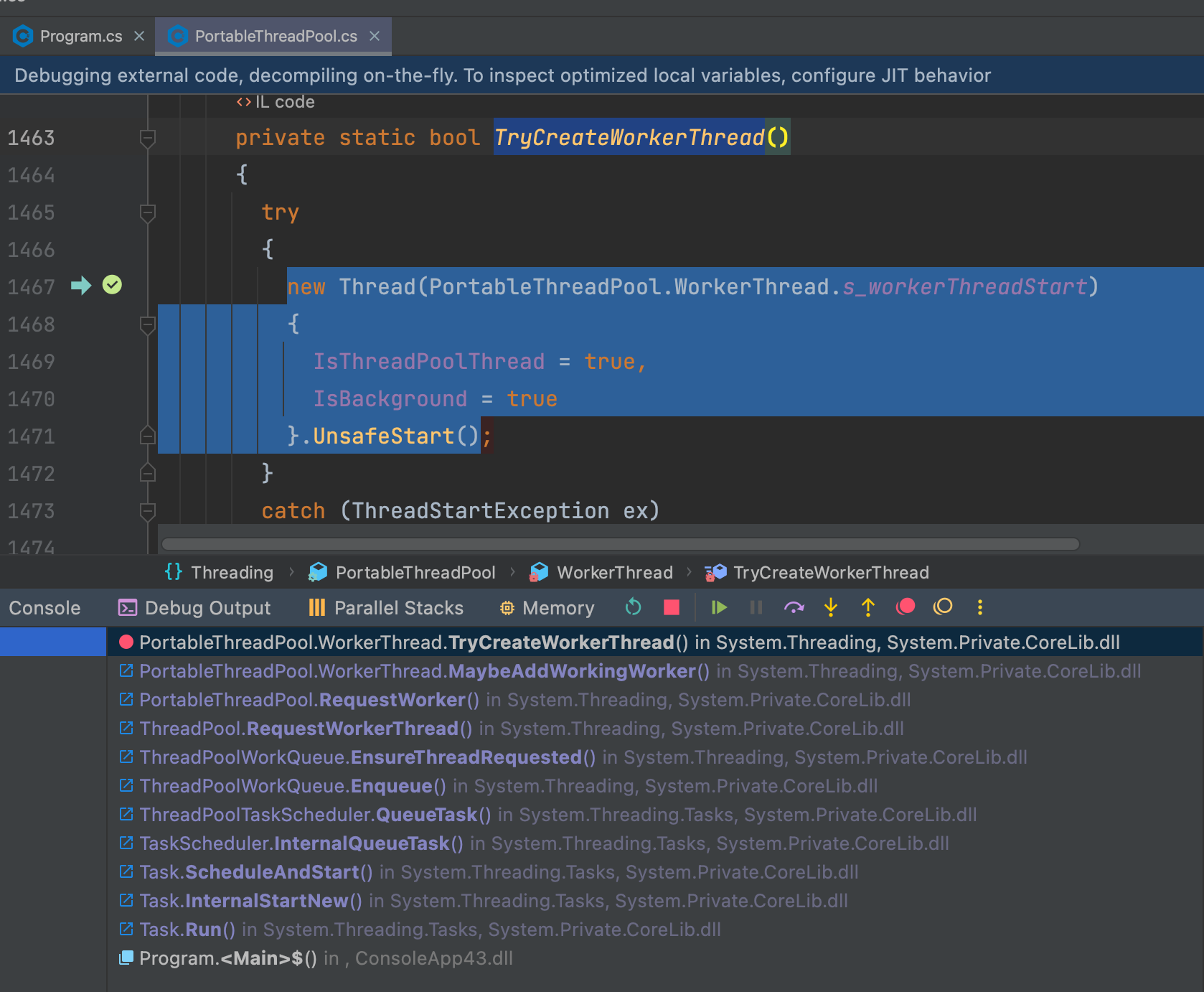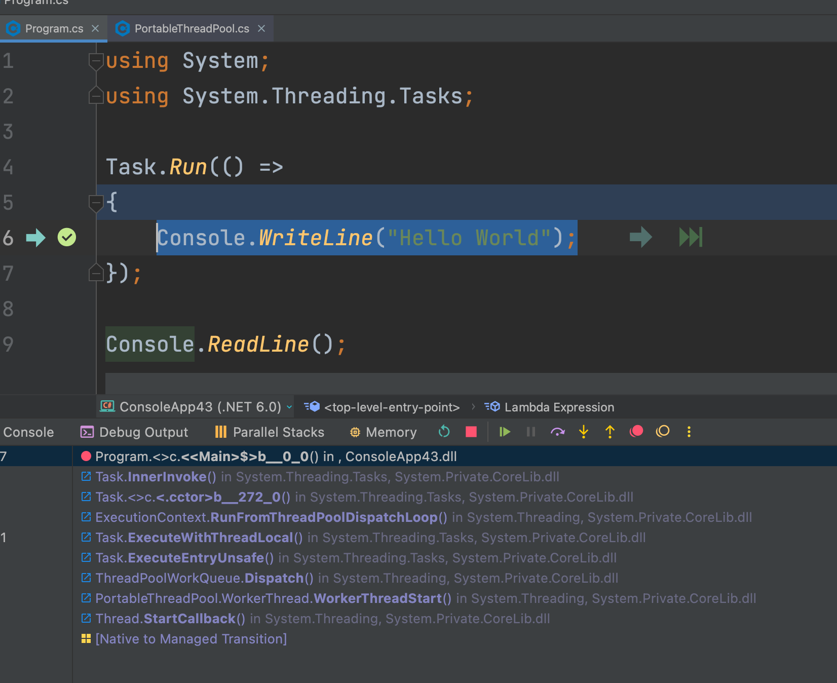 在 PortableThreadPool.TryCreateWorkerThread 和实际要要执行的 lambda 表达式中打上断点,我们便可以清晰的看到整个执行过程。