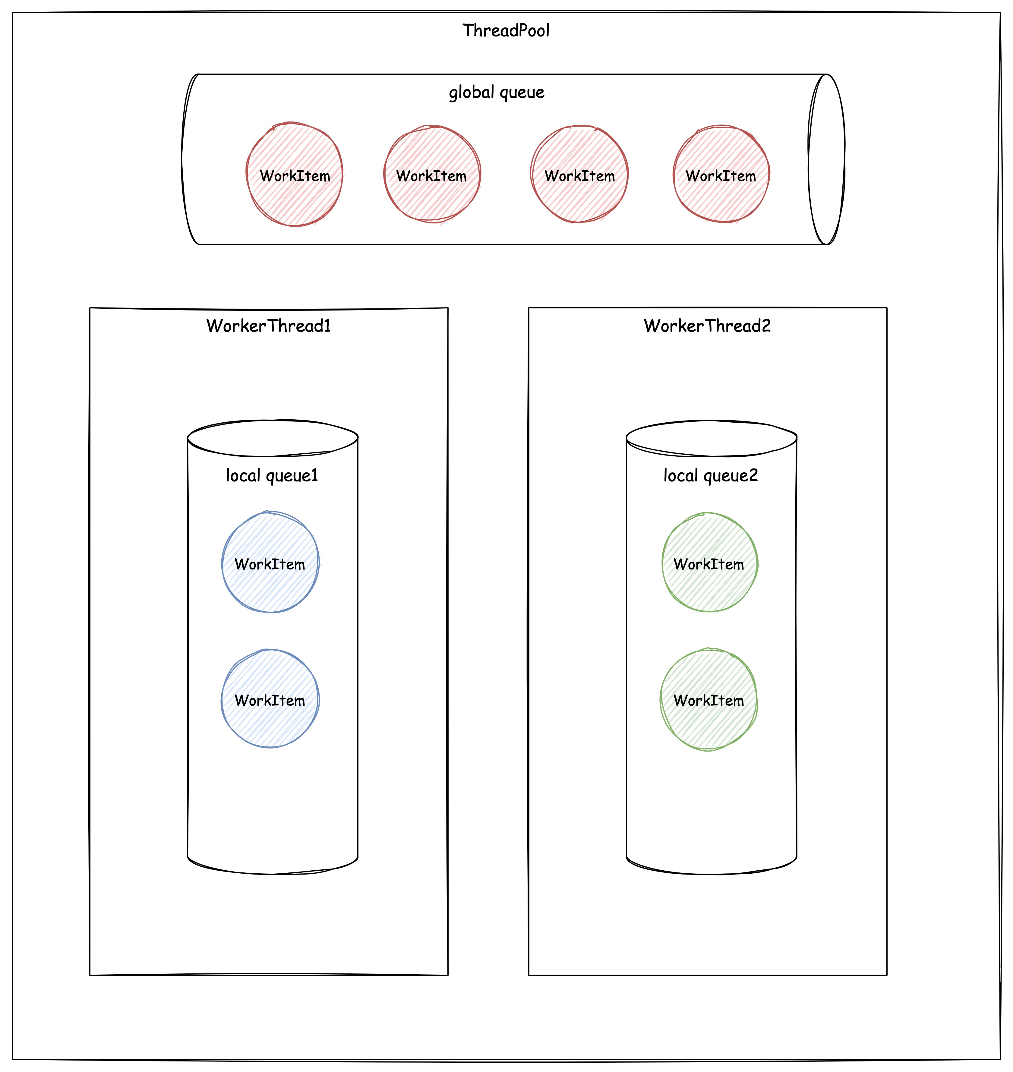 线程池的待执行任务被存放在一个队列系统中。这个系统包括一个 全局队列,以及绑定在每一个 Worker Thread 上 的 本地队列 。而线程池中的每一个线程都在执行 while(true)