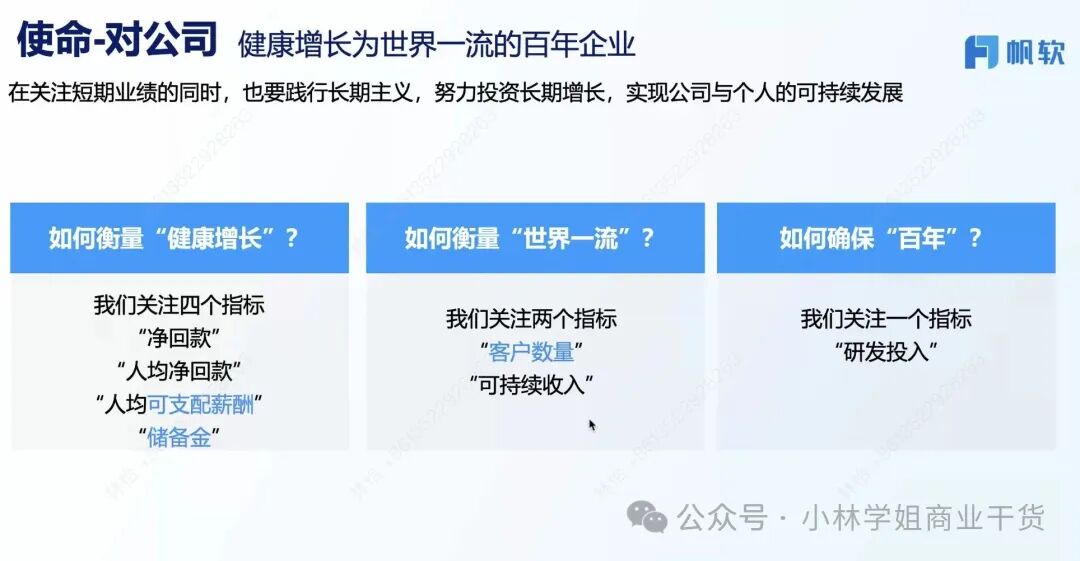 财务核心指标中除了关注净回款、人均净回款、储备金,也关注人均可支配薪酬和研发投入——很大提高人才质量。提高可支配薪酬。