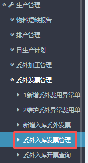 1. 进入ERP系统之后,在左侧的功能菜单里找到“生产管理”,点开“委外发票管理”,点击“新增入库委外发票”。