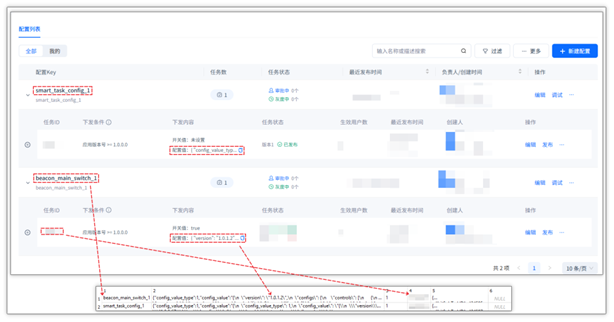 平台云控配置与本地拉取后数据库对应关系:下图为 Shiply 平台所创建的云控配置,其中创建 smart_task_config_1 与 beacon_main_switch_1 配置键和相对应的配置值,在本地获取上述云控配置时,Shiply SDK 会将这些配置存储于指定的数据库文件中。该数据库具体路径为: C:\ProgramData\SogouInput\SGBizConfig\{APPID_SYSTEMID___}.db,此数据库为 SQLite 数据库。