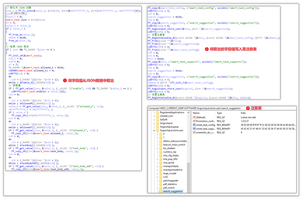 随后从云控配置(JSON 数据)中提取数据后,将数据存储至注册表 SOFTWARE\SogouInput.store.user\search_suggestion 项中的 smart_task_config 和 smart_task_supports 键。其中,前者为提取的配置,后者为经加密处理的 allowed_p 字段,此字段代表允许的进程,即执行该任务的进程必须与 allowed_p 字段的值相符。