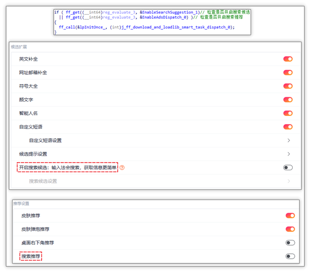 此时搜狗输入法 IME 组件被加载至 explorer.exe 进程时,将会调用 ImeInquire 函数,随后便开始检查是否开启搜索候选与搜索推荐。若二者之中有一项处于开启状态,便会进入解析云控配置的逻辑流程。从中能够看出,相关按钮是针对搜索候选和推荐的,不应与修改浏览器主页存在关联。