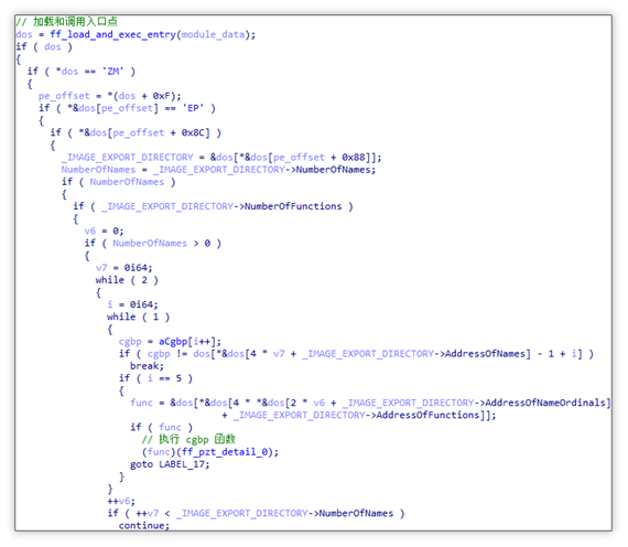 加载推广模块并调用入口点和 cgbp 导出函数:随后,将解密后的推广模块以手动加载的方式载入内存。在完成检查 PE 头、进行 Section 映射、开展重定位处理、修复导入表以及修改 Section 权限等操作之后,会调用模块入口点以进行初始化。之后,通过遍历导出函数的方式获取 cgbp 导出函数地址,并调用该函数,由此进入推广模块的主要逻辑。