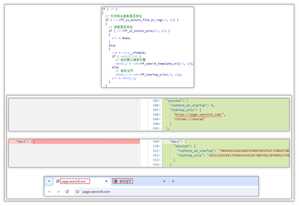 修改默认搜索引擎:通过写入 Preferences 与 Secure Preferences 配置文件的方式将 template_url_data 中 url 设置为 baidu.wenxin9.com/?{searchTerms}&type=0002&ie={inputEncoding}。之后用户再次搜索内容时先跳转到 baidu.wenxin9.com/?搜索内容&type=0002&ie=UTF-8,最终跳转至 www.baidu.com/s?tn=75144485_10_dg这类带有来源标识的链接并从中获利。