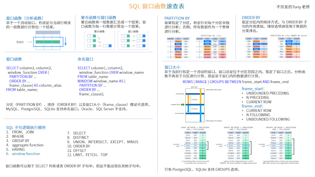 今天给大家分享一个 SQL 窗口函数的速查表,包括窗口函数的语法、窗口函数列表以及相关示例,内容适用于 MySQL、Oracle、SQL Server、PostgreSQL 以及 SQLite 等关系型数据库。