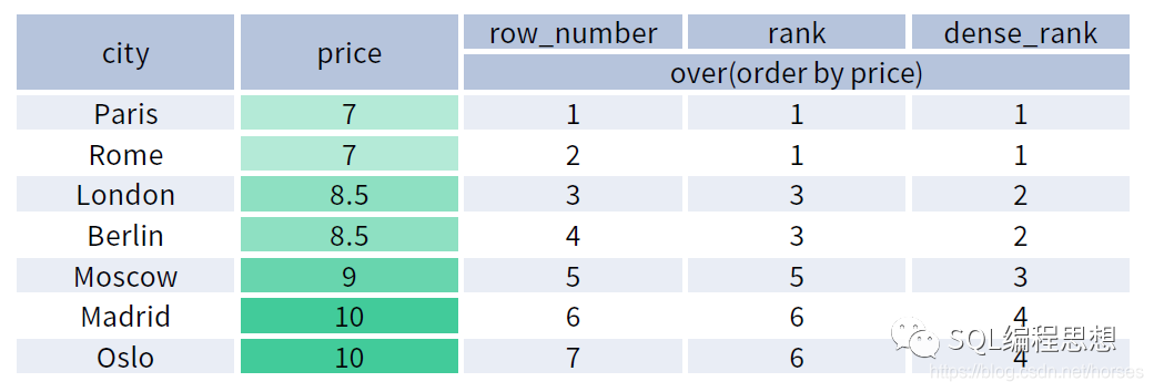 下图演示了 ROW_NUMBER()、RANK() 以及 DENSE_RANK() 函数的效果: