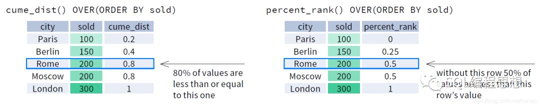 下图演示了 CUME_DIST() 和 PERCENT_RANK() 函数的效果: