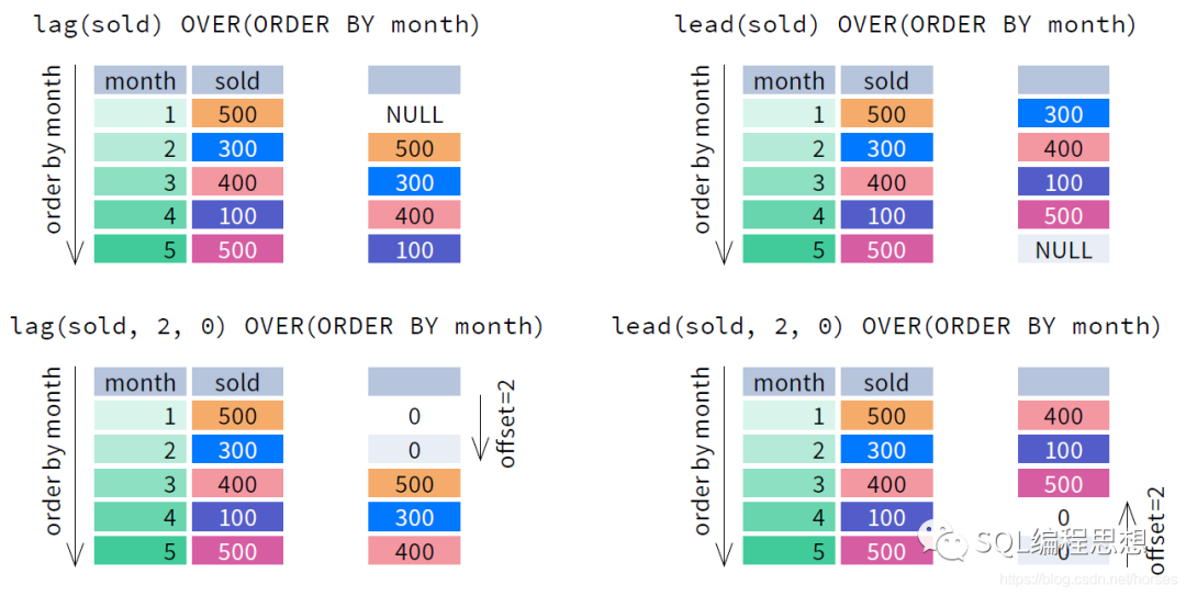 下图演示了 LAG(expr, offset, default) 和 LEAD(expr, offset, default) 函数的效果: