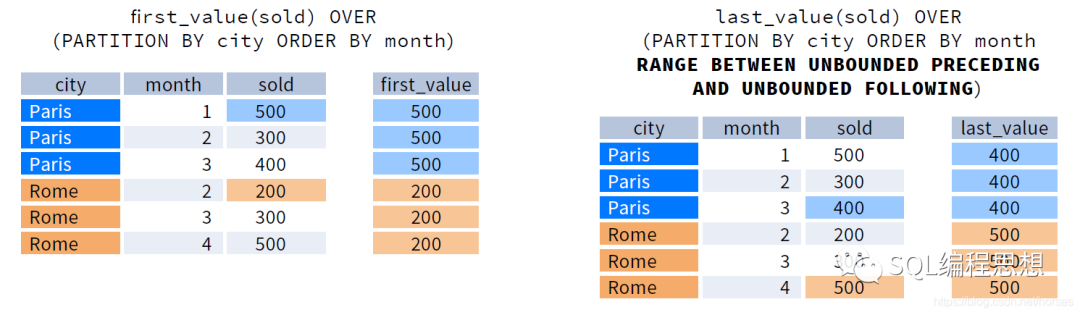 下图演示了 FIRST_VALUE(expr) 和 LAST_VALUE(expr) 函数的效果: