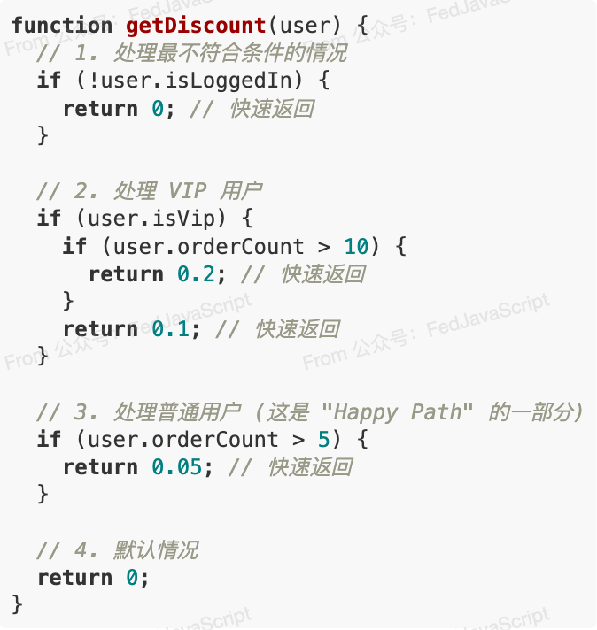 这种模式的指导思想是:在函数的开头,优先处理所有的异常、边缘或无效情况,并立即返回。 这样,函数的主体部分就可以专注于处理“快乐路径(Happy Path)”,即最核心、最正常的逻辑。