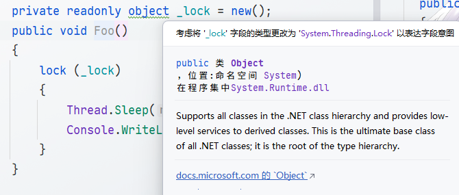 可读性/安全性 | 用 object ,可能误用;不容易一眼看出这是锁对象 | 用 Lock 类型,代码语义直接告诉你“这是用来加锁的” |