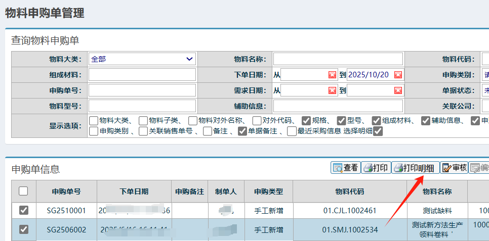 点晴模切ERP-申购单勾选明细打印功能-操作流程