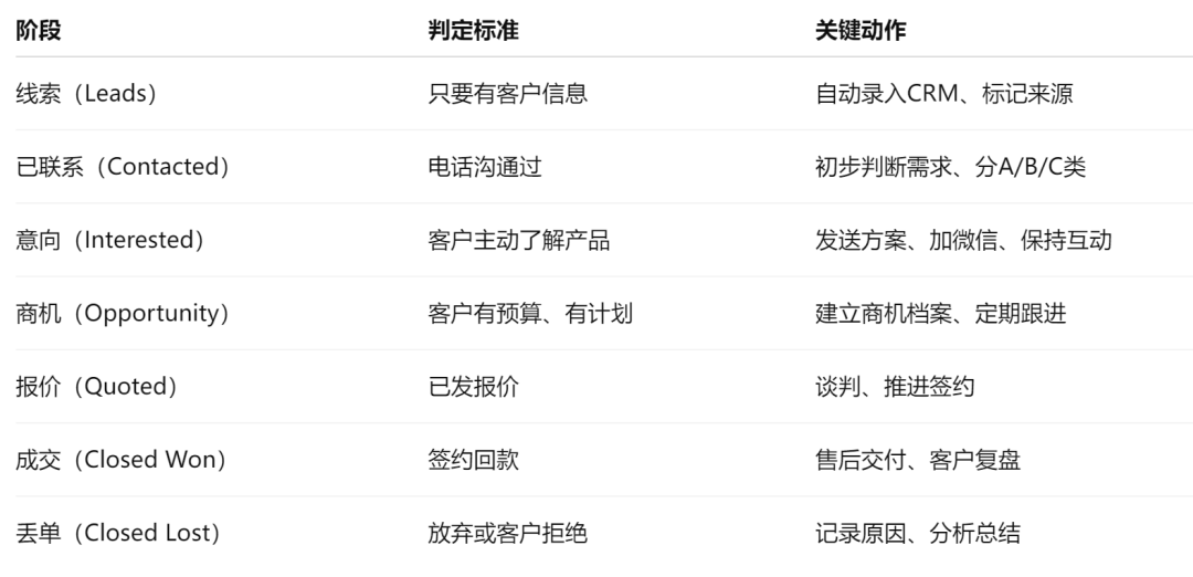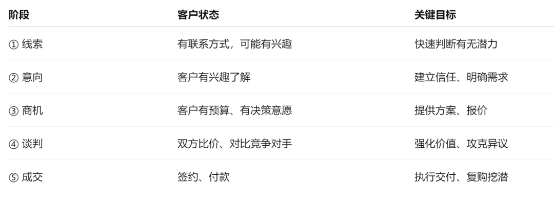 每个阶段都对应不同的动作和策略。如果你不分阶段,只知道“客户很多”,那根本不知道该怎么推进。