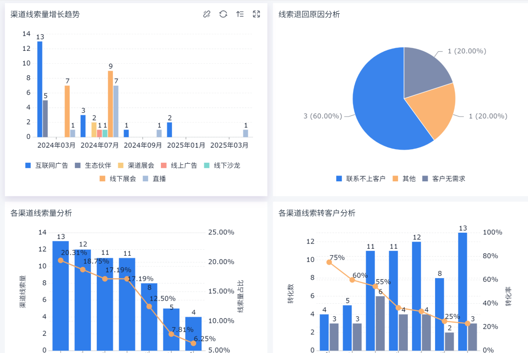 • 商机→成交转化率低:方案竞争力不足或报价策略有问题。
