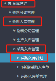 1. 进入ERP系统,在左侧或者是上方菜单栏上找到”仓库管理“》”物料入库管理“》”采购入库管理“》”采购入库计划“