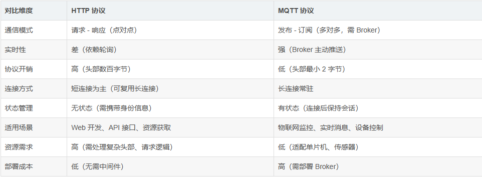 综上,HTTP 是 “通用型协议”,适配 Web 生态的多样化需求;MQTT 是 “专用型协议”,聚焦物联网的轻量、实时通信。