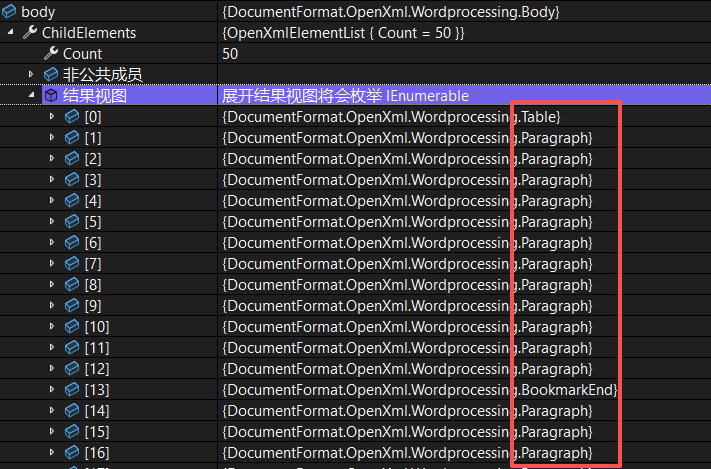如果是提取文本,可以在文档的Body.Elements中遍历OpenXmlElement。在方法doc.body.Elements<T>()中T表示继承OpenXmlElement的泛型。我们需要关注的类型主要有: