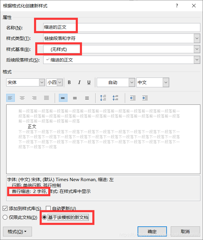 然后,将所有级别的标题都这么设置即可。 3 解决方法B(推荐)既然要新建一个样式,那我们就干脆新建一个新的、带着缩进的“正文”,这样子就不用一一修改标题的“基准样式”了;另一方面,有的时候我用方法A还不管用。因此建议大家用如下的方法。 借助方法A中的方式,我们新建一个样式,我这里命名为“缩进的正文”;其关键配置如下: